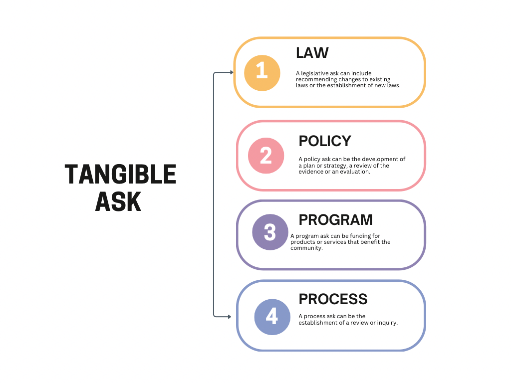 When making recommendations to governments on possible solutions to address these problems, developing a tangible ask is one of the first steps in the process.